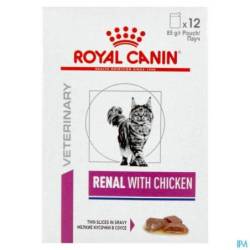 ROYAL CANIN® RENAL WITH CHICKEN dunne plakjes in jus is een volledig dieetvoeder voor katten dat is samengesteld om de nierfunctie te ondersteunen bij chronische nierinsufficiëntie, door zijn beperkte gehalte aan fosfor en hoogwaardige eiwitten. RENAL WITH CHICKEN is ook geformuleerd om de vorming van oxalaatstenen te verminderen door zijn lage calcium- en vitamine D-gehalte en zijn urine-alkaliserende eigenschappen. AANBEVELINGEN: Het wordt aanbevolen om voor gebruik of voor verlenging van de gebruiksperiode het advies van een dierenarts in te winnen. Voer in eerste instantie RENAL MET KIP tot 6 maanden bij chronische nierinsufficiëntie en vermindering van de vorming van oxalaatstenen.