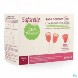 Maat 1 van de Saforelle Cup Protect menstruatiecup is aanbevolen voor vrouwen met licht bloedverlies en die niet op een natuurlijke manier zijn bevallen.