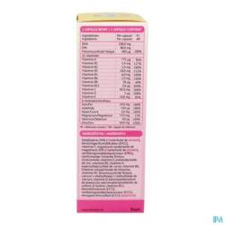 Ingrediënten: Gelatine, DHA (visolie), bevochtiger/ (E422), calcium ascorbaat, magnesium oxide, EPA (visolie), verdikkingsmiddel (E901), ijzerfumaraat, nicotinamide, DL alfatocoferylacetaat, zinkoxide, calcium D-pantothenaat, bètacaroteen, kopersulfaat, pyridoxinewaterstofchloride, thiamine nitraat, riboflavine, pteroylmonoglutaminezuur, calcium l-methylfolaat, cholecalciferol, kaliumjodide, natriumseleniet, D-biotine, cyanocobalamine, kleurstof (E172), verdikkingsmiddel (E551), emulgator (E322) (soja).