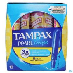 Tampax Pearl Compak tampons zijn de beste tampons in het Tampax assortiment voor comfort, bescherming en discretie. Ze zijn geurvrij Tampax Pearl Compak tampons hebben een zachte, compacte en discrete plastic applicator met een afgeronde punt voor comfortabel inbrengen. Applicator met gemakkelijk vast te pakken greep voor gemakkelijk en comfortabel inbrengen. Met MotionFit-technologie zet Tampax Pearl Compak zachtjes uit om zich aan te passen aan uw unieke lichaamsvorm. Bovendien helpt de LeakGuard anti-lekvlecht om lekken te voorkomen voordat ze zich voordoen. Tampax Pearl Compak tampons zijn verpakt in een kleurrijk en stevig speciaal handtaszakje, gemakkelijk te openen en discreet. Tampax Pearl Compak Regular zijn de beste tampons in het Tampax-assortiment met absorptie aangepast aan regelmatige stromen. Tampax Pearl Compak tampons zijn getest onder gynaecologische controle. Daarnaast zijn ze onafhankelijk gecontroleerd door Oeko-Tex op de aanwezigheid van ongewenste stoffen.