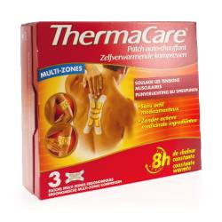 ThermaCare zelfverwarmende kompressen verlichten op doeltreffende en gerichte wijze spier- en gewrichtspijnen ten gevolge van spierspanningen, artrose, verrekkingen, spierstijfheid of verstuikingen. ThermaCare Multi-zones kunnen exact op de plek van de pijn geplaatst worden: midden van de rug, arm of kuit.Geschikt voor zowel chronische als incidentele pijnen. Bevat geen actieve medicinale ingrediënten. ThermaCare zelfverwarmende kompressen bevatten warmte-elementen en bieden effectieve en langdurige pijnverlichting : geeft 8 uur constante warmte voor een doeltreffende pijnverlichting. Zodra de verpakking geopend wordt, komen de elementen in aanraking met zuurstof waardoor ze warm worden. Dit zorgt voor langdurige therapeutische warmte die pijnverlichting geeft.