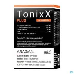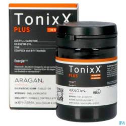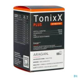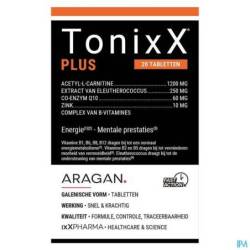 2 tabletten TonixX PLUS bevatten 1500mg acetyl-L-carnitine, 100 mg co-enzym Q10, 1,1 mg vitamine B1 (100% RI), 1,4 mg vitamine B2 (100% RI), 16 mg vitamine B3 (100% RI), 6 mg vitamine B5 (100% RI), 1,4 mg vitamine B6 (100% RI), 2,5 µg vitamine B12 (100% RI), 200 µg foliumzuur (100% RI), 50 µg biotine (100% ADH) en 10 mg zink (100% RI, onder vorm van bisglycinaat, een moderne, goed opneembare vorm).