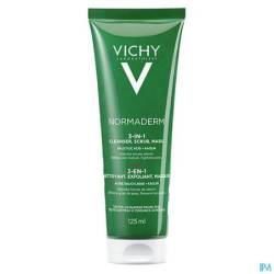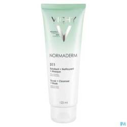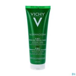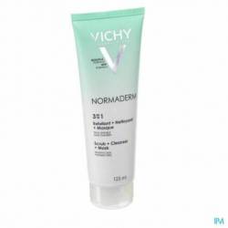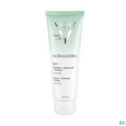 Vichy Normaderm 3-in-1 Cleansing Care fungeert als gezichtsreiniger, scrub en masker voor de gevoelige acnegevoelige huid en de vette huid met onzuiverheden.