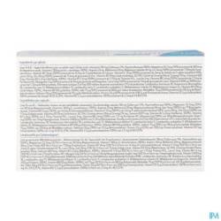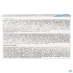 (met % R.I. = Referentie Inname voor een gemiddelde volwassene): Zuurbestendige capsules 118mg (Gellan gom 5%, Hypromellose qsp 100%), Magnesium 112,5mg (30%) van187,4mg Magnesiumoxide, Vitamine C 80mg (L-ascorbinezuur, 100%), Arginine 20mg, Methionine 20mg, Magnesiumstearaat 18 mg, IJzer 14mg (100%) van77, 8mg Ferro Fumaraat, Vitamine B5 12mg (200%) uit 14,1mg Calcium D-Pantothenaat, Vitamine E 12mg (100%) uit 24mg D-alfa tocoferol acetaat 50%, Lysine 10mg, Zink 10mg (100%) uit 71,4mg Zink Gluconaat, Vitamine B3 10mg (Nicotinezuur, 62,5%), Ginsengextract (Panax Ginseng) 10mg, Co-enzym Q10 5mg, Vitamine B2 4,2mg (Riboflavine, 300%), Vitamine B1 3,3mg (300%) uit 3,75mg Thiamine HCL, Leucine 2mg, Vitamine B6 1,4mg (100%) uit 1,71mg Pyridoxine HCl, Mangaan 1mg (50%) van 10mg mangaan-gluconaat, koper 1mg (100%) van 7,1mg kopergluconaat, vitamine A 800μg (100%) van 5,33mg retinol-acetaat, 8 melkzuurbacteriën 0,47mg (100 miljoen kiemconcentratie CFU bij productie: Lactobacillus rhamnosus 18, Streptoccocus thermophilus 18, Lactobacillus casei 13, Bifidobacterium bifidum 13, Lactobacillus lactis 11, Lactobacillus acidophilus 11, Bifidobacterium infantis 10, Bifidobacteriumlongum 6), Vitamine B9 200μg (foliumzuur, 100%), Vitamine B8 150μg (biotine, 300%), Jodium 75μg (50%) uit 98,6μg kaliumjodide, Molybdeen 75μg (150%) uit 120,9μg natriummolybdaat, Selenium 50μg (91%) uit 111,1μg natriumseleniet, Chroom 25μg (63%) uit 208, 3μg chroompicolinaat, Vitamine D3 5μg (cholecalciferol, 100%) uit 2mg Vit D3 0,25%, Vitamine B12 2,5μg (cyanocobalamine, 100%) uit 2,5mg Vit B12 0,1%.