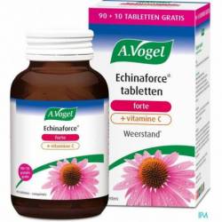 Eén tablet Echinaforce forte + vitamine C bevat 75% van de aanbevolen dagelijkse hoeveelheid vitamine C. Vitamine C is een essentiële vitamine voor het menselijk lichaam. Het ondersteunt de weerstand en bevordert de opname van ijzer uit de maaltijd. Vitamine C is bovendien een anti-oxidant dat helpt bij de bescherming van gezonde lichaamscellen. Zo speelt het een belangrijke functie bij het behoud van gezonde botten, tanden, goede bloedvaten en andere lichaamsweefsels.